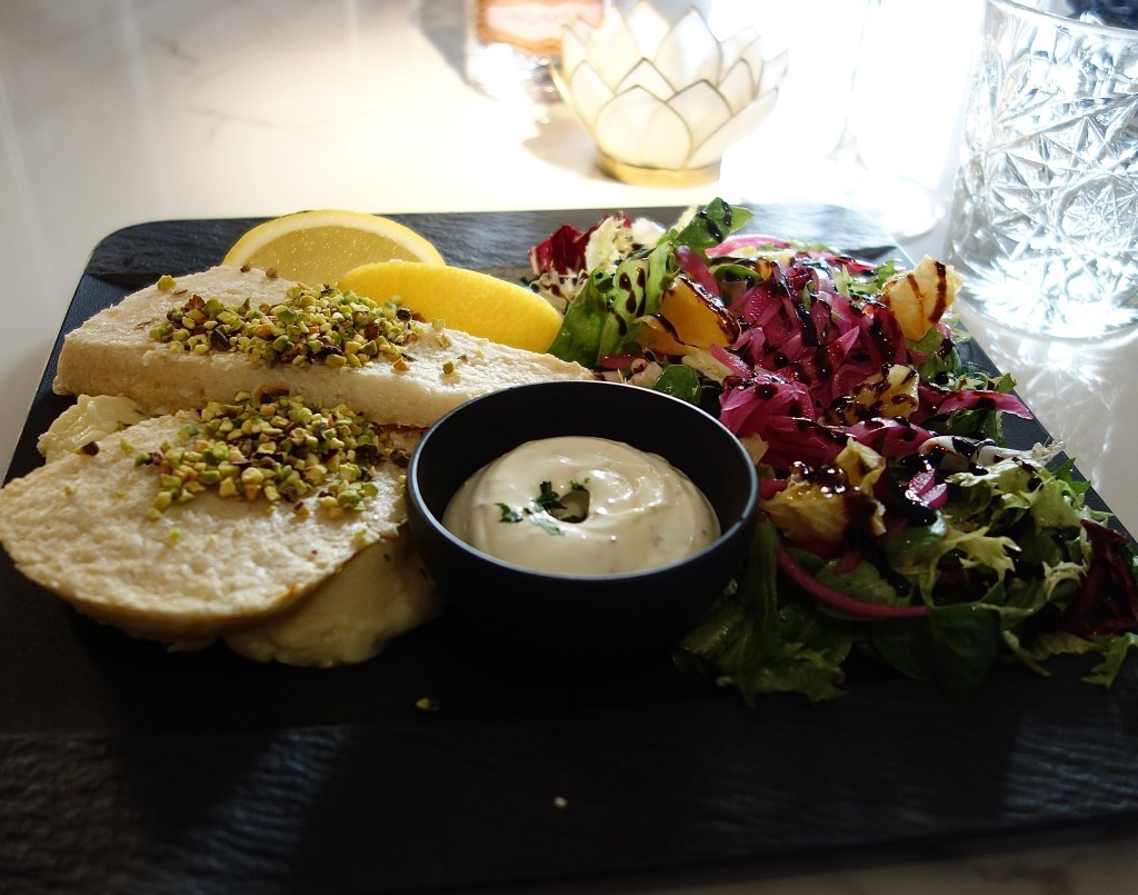 fish fillets hake-style coated with pistachio and served with lemon potato mousse and salad with oranges and red onion.